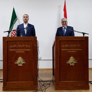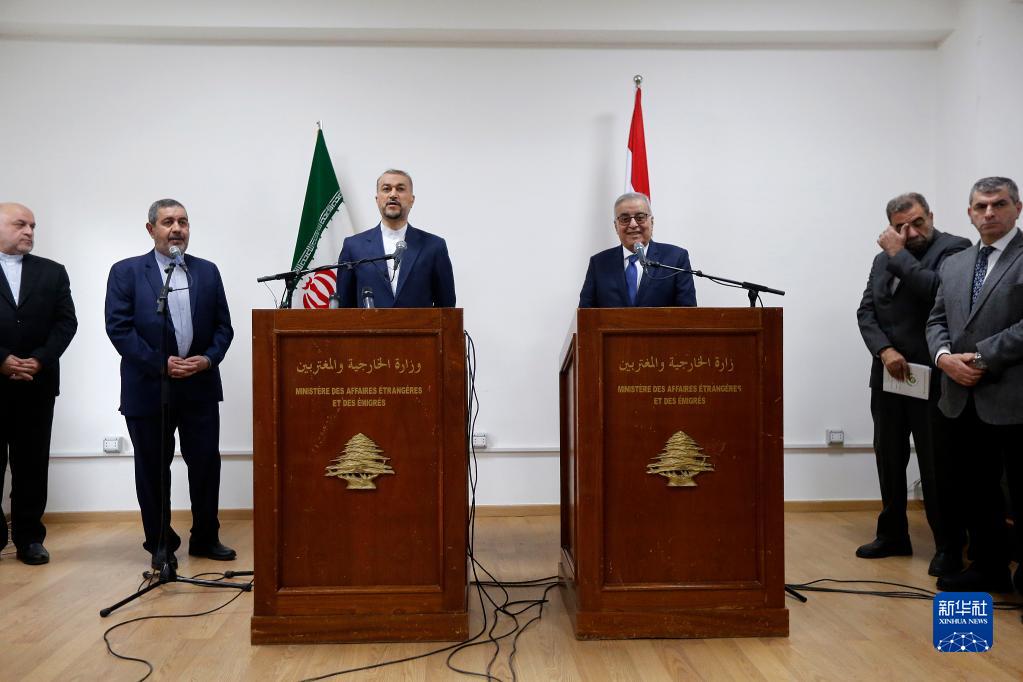 1月13日,在黎巴嫩貝魯特,伊朗外長阿卜杜拉希揚(中左)和黎巴嫩外長哈比卜(中右)共同出席新聞發布會。