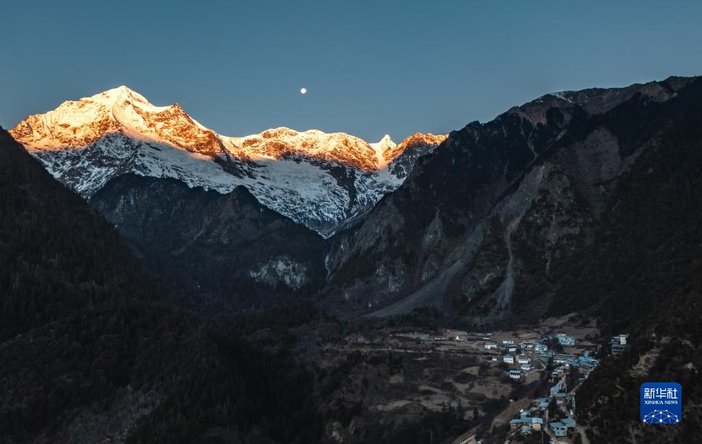 1月9日在雨崩村拍攝的梅里雪山“日照金山”景象(無人機照片)。