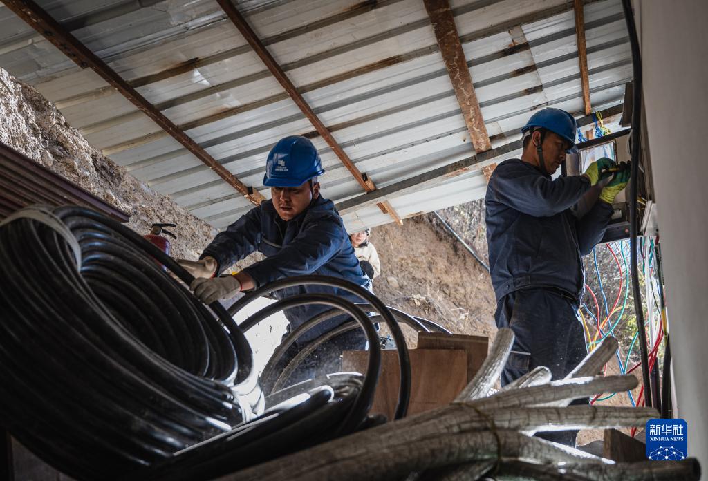 1月9日,旺登(右)與同事張金程為雨崩村內的客棧檢修電路。