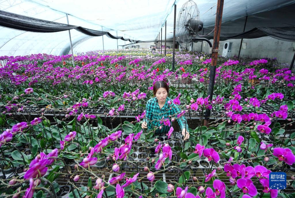1月14日,唐山市灤南縣宋道口鎮東清水村的花農在大棚內管護蝴蝶蘭。
