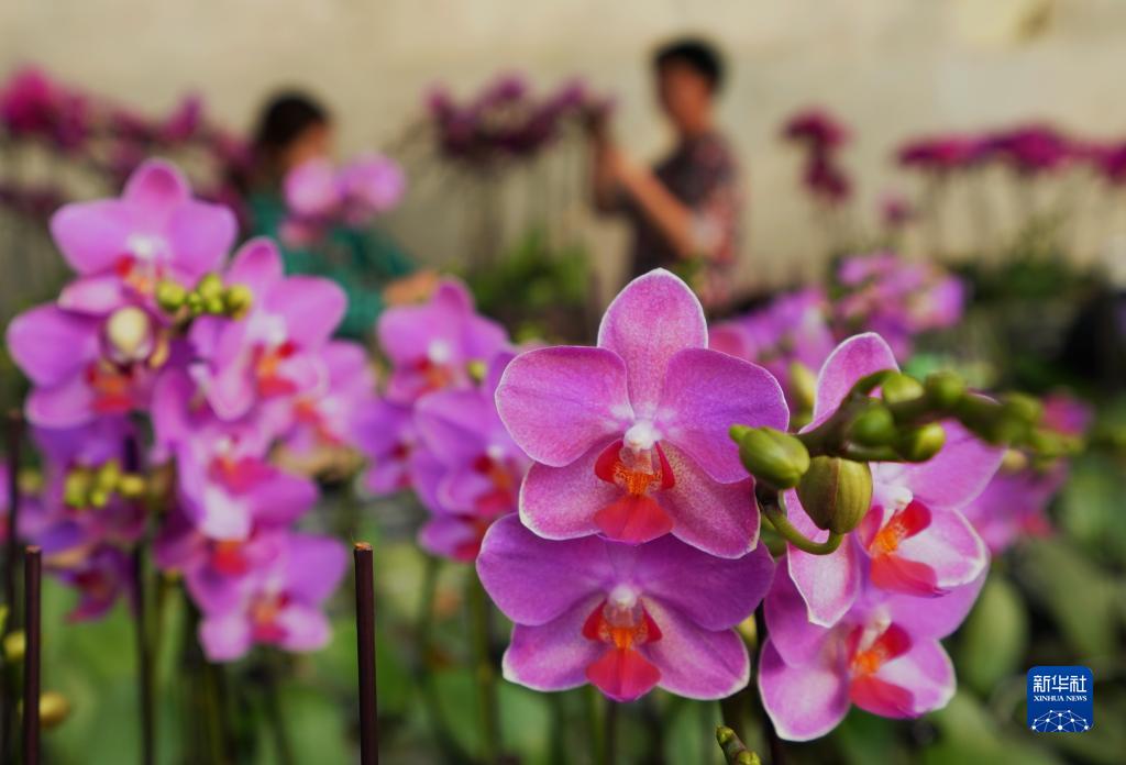 1月14日,唐山市灤南縣宋道口鎮東清水村的花農在大棚內管護蝴蝶蘭。