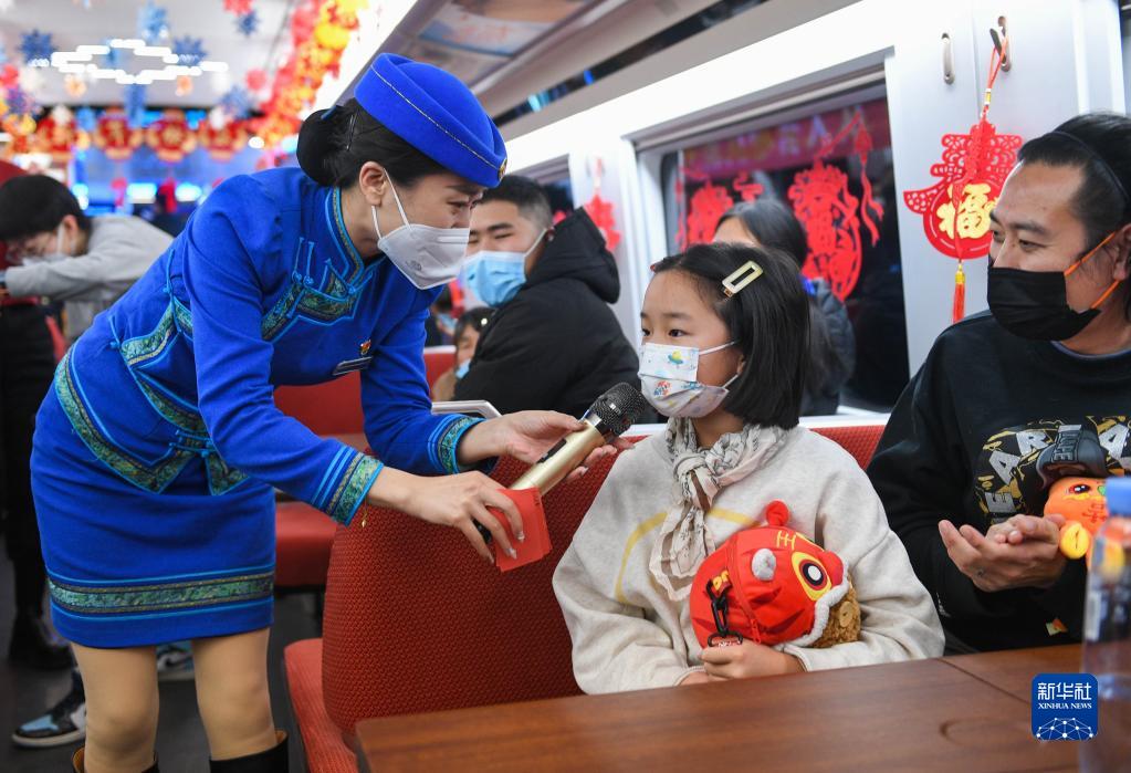 當(dāng)日正值北方小年,北京開往呼和浩特的G2457次復(fù)興號(hào)列車被乘務(wù)員們布置得喜氣洋洋。高鐵乘務(wù)員和鐵路烏蘭牧騎隊(duì)員們,不僅為旅客奉上一臺(tái)精彩演出,還準(zhǔn)備了豐富的節(jié)日禮品,一路歡聲笑語伴隨著乘客。