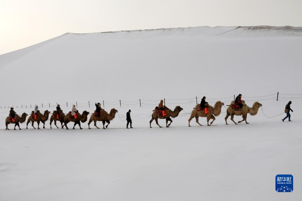 1月13日,游客在甘肅省敦煌市鳴沙山月牙泉景區欣賞雪景。