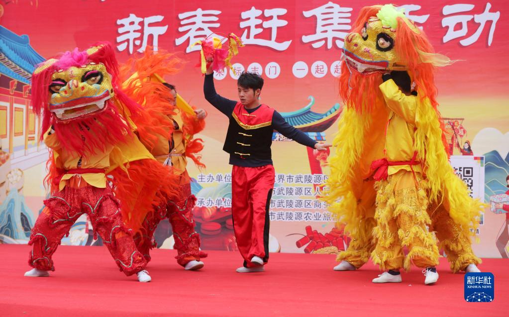 1月14日,在湖南省張家界市武陵源區(qū)舉行的“趕年集 迎新春”活動(dòng)現(xiàn)場(chǎng),當(dāng)?shù)厝罕姳硌菸瑾{。