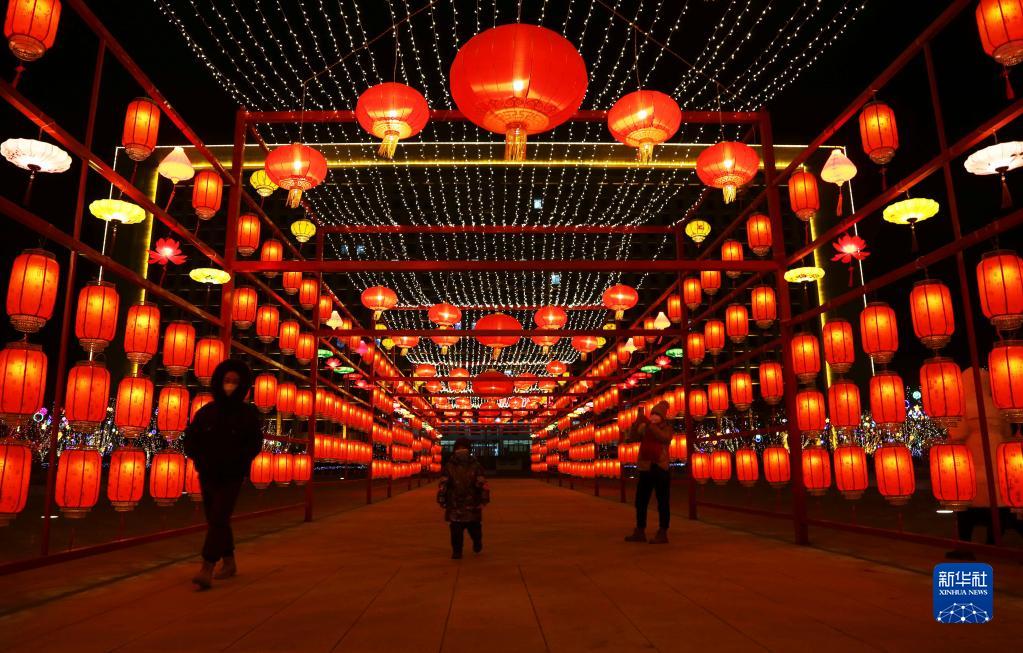 1月13日,市民在甘肅省定西市一處廣場欣賞迎春燈飾。