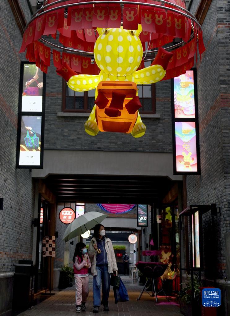 1月13日,人們漫步在“紅包兔”彩燈裝扮的弄堂中。