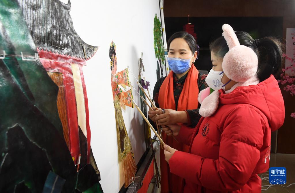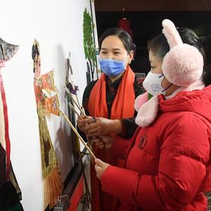 1月14日,在海淀北部文化中心,小朋友在體驗(yàn)皮影戲表演。