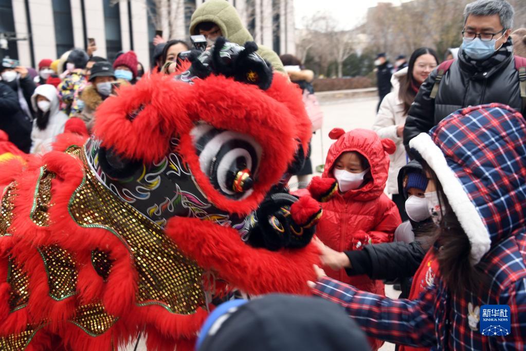 1月14日,在海淀北部文化中心外,人們在觀看舞獅。
