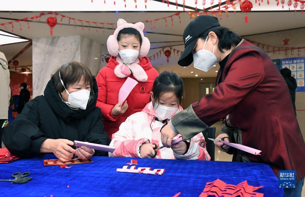 1月14日,在海淀北部文化中心,小朋友在學習剪紙。