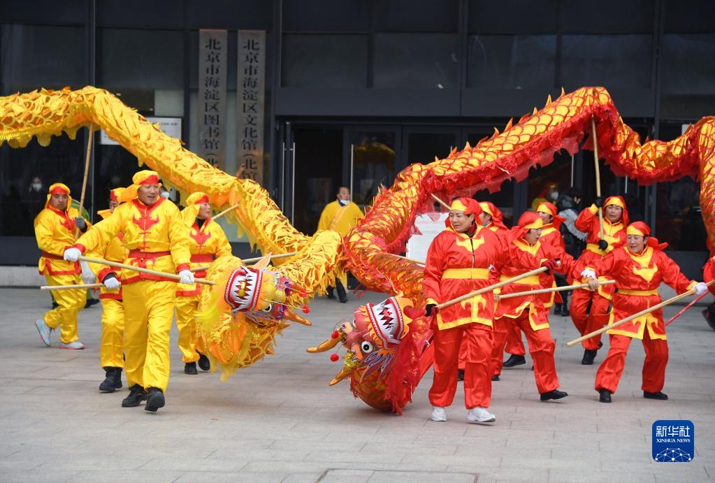 1月14日,在海淀北部文化中心外,居民在表演舞龍。