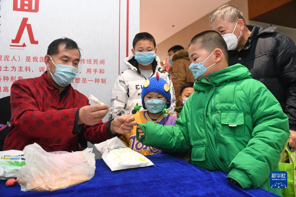 1月14日,在海淀北部文化中心,小朋友在觀看“捏面人”。