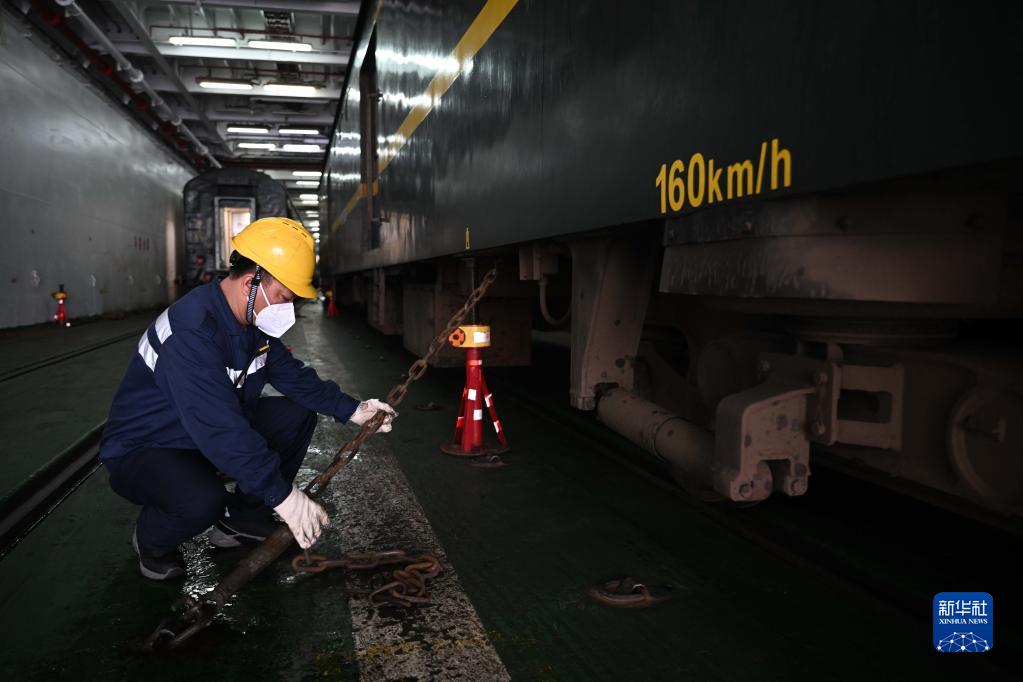 在停靠廣東徐聞粵海鐵路北港碼頭的輪渡的列車甲板上,劉昱進行列車綁扎固定作業(1月8日攝)。