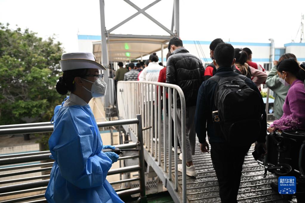 肖遙(左)在旅客登上棧橋離船時值守(1月8日攝)。