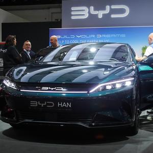 1月13日,人們?cè)诒壤麜r(shí)布魯塞爾車展媒體開放日上參觀比亞迪漢電動(dòng)汽車。