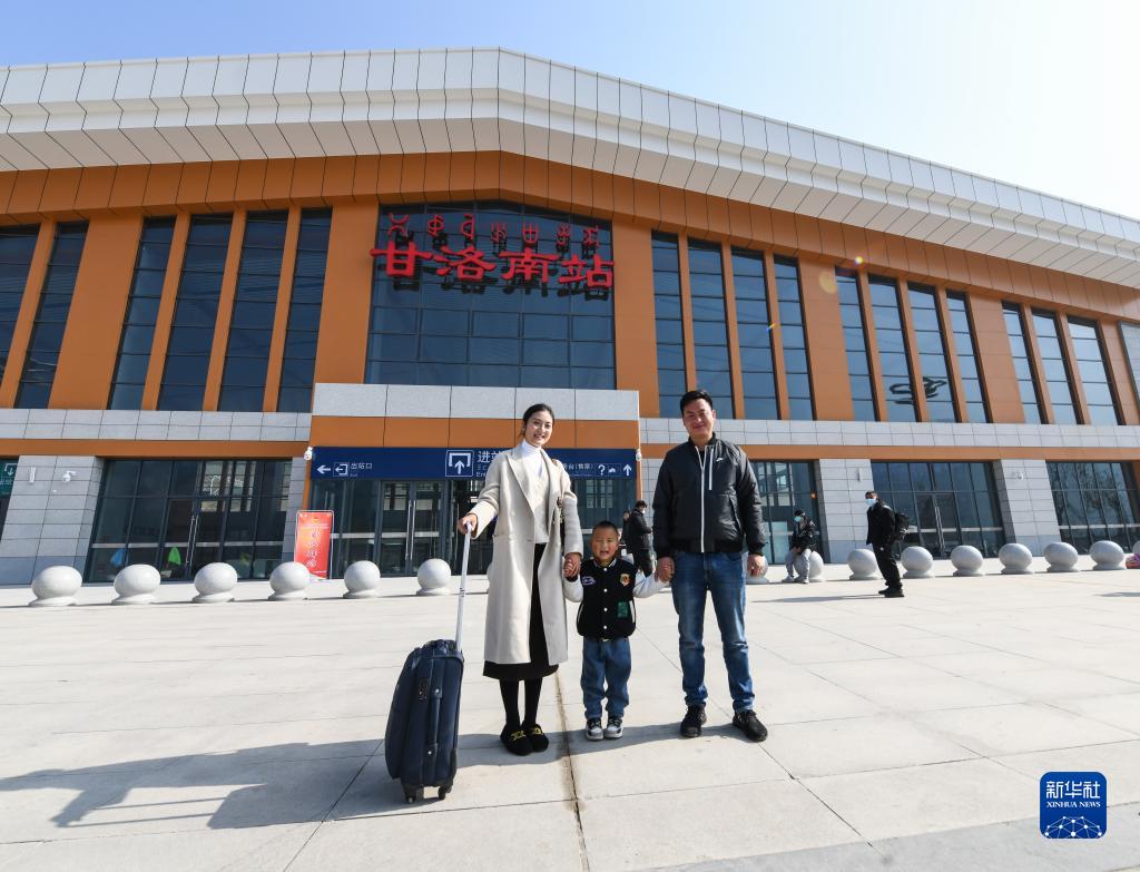 1月12日,在甘洛南站,退乘回家的阿依布卡(左)、丈夫阿木古乃(右)和兒子邱煜揚在站前廣場合影。新成昆鐵路的全線貫通運營,也極大縮短了她回家的時間。