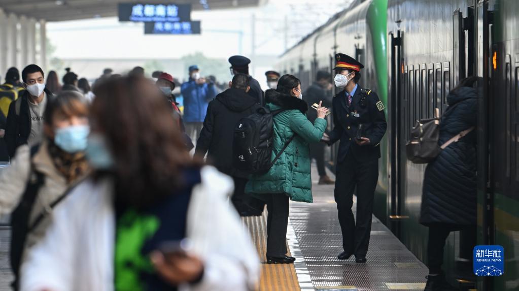 1月11日,在成都火車南站,一位旅客詢問阿依布卡(右二)車廂位置。