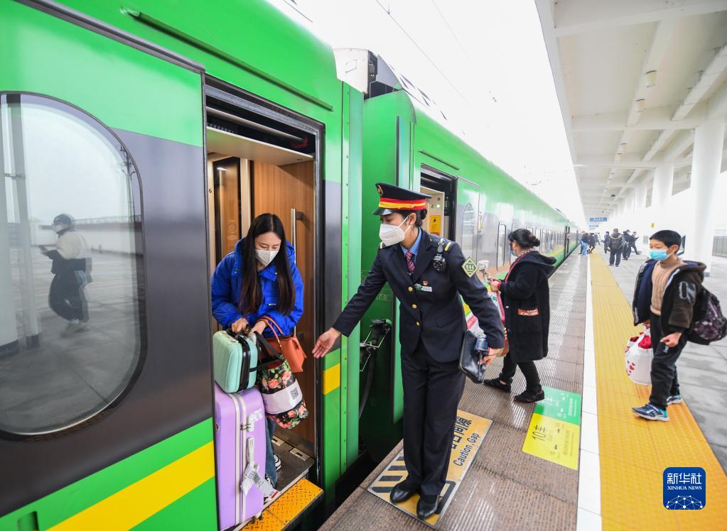 1月11日,在樂山北站,阿依布卡(左二)引導(dǎo)旅客下車。