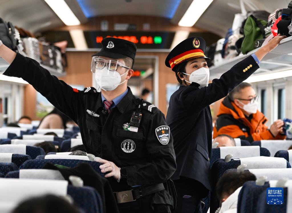 1月11日,在C43次列車上,阿依布卡(右)和列車安全員在車廂巡視。
