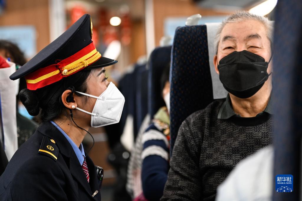 1月11日,在C43次列車上,阿依布卡(左)和一位旅客交流。