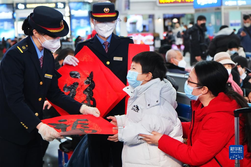 1月14日,天津站工作人員在候車大廳為旅客送上福字。