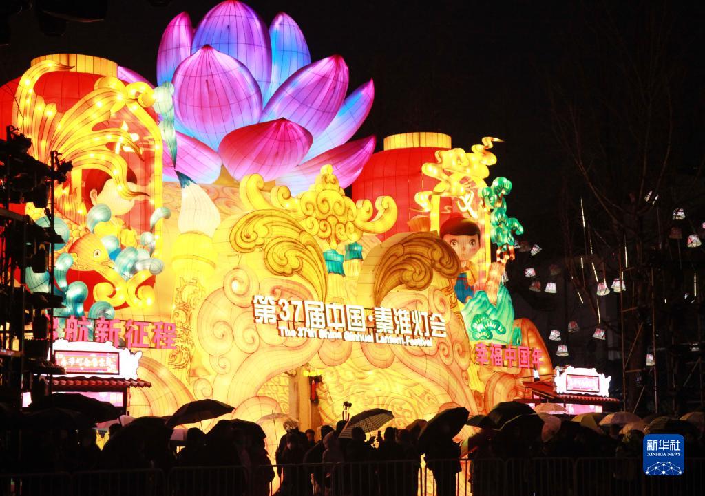 當晚,第37屆中國·秦淮燈會在南京夫子廟景區舉行點燈儀式,吸引不少市民游客。本屆燈會共設置各類燈組170組。新華社發(劉建華攝)