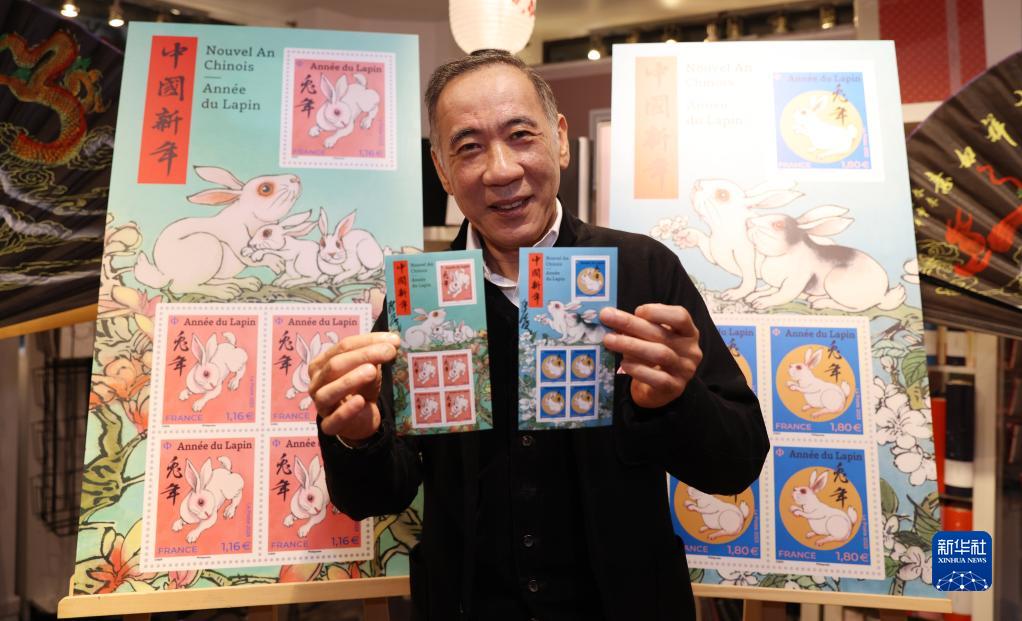 為迎接中國農歷新年,法國郵政公司14日在巴黎舉行中國兔年生肖紀念郵票發行儀式。中國兔年生肖紀念郵票共兩款,由法國華人藝術家陳江洪設計。新華社記者 高靜 攝