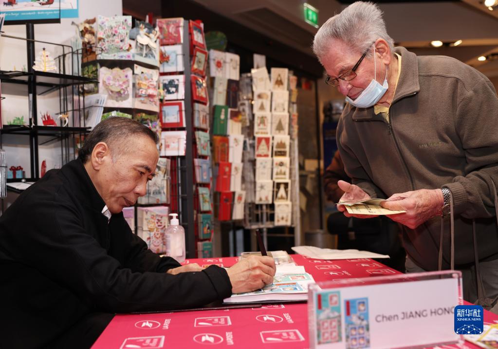 1月14日,在法國(guó)巴黎舉行的兔年生肖郵票發(fā)行儀式上,郵票設(shè)計(jì)者陳江洪(左)為集郵愛(ài)好者簽售兔年生肖紀(jì)念郵票。