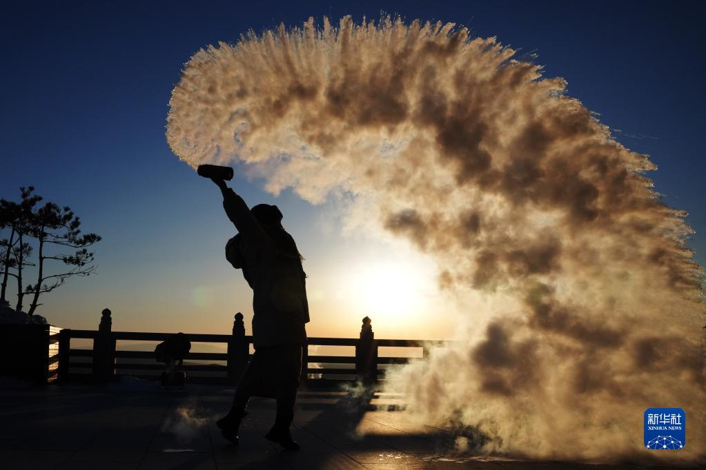 1月14日,在撫遠市東極閣,游客在日出時玩“潑水成煙”。