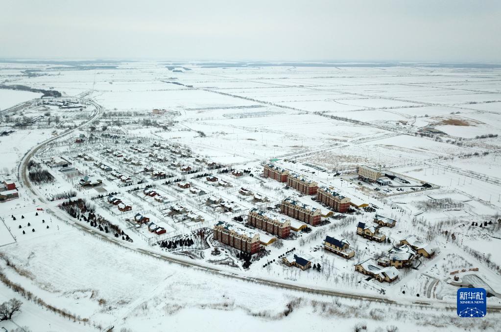 1月11日拍攝的撫遠市烏蘇鎮抓吉赫哲族村的赫哲新居(無人機照片)。