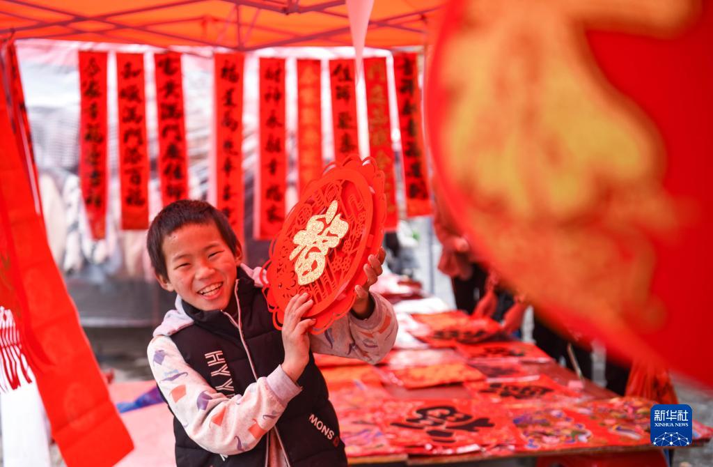 1月14日,小朋友在貴州省銅仁市松桃苗族自治縣寨英古鎮的集市上選購“?!弊?。