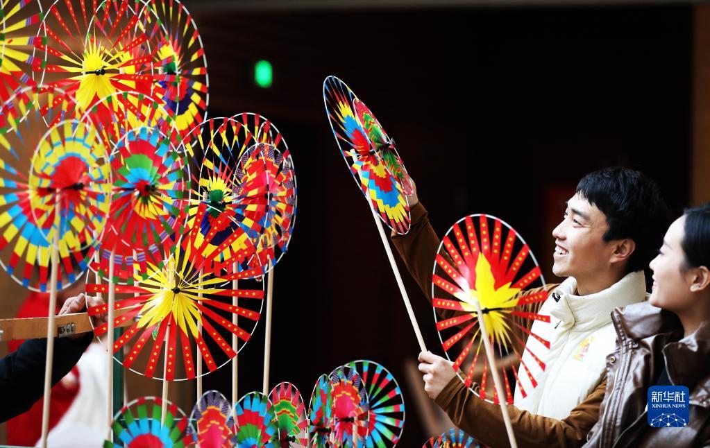 1月14日,人們在山東省臨沂市“非物質文化遺產月”活動現場觀賞民間藝人制作的風車。