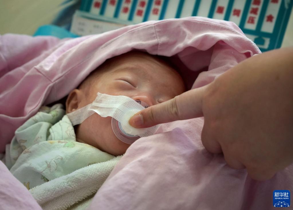 醫(yī)護人員在對患兒進行非營養(yǎng)吸吮訓練安撫患兒(1月10日攝)。
