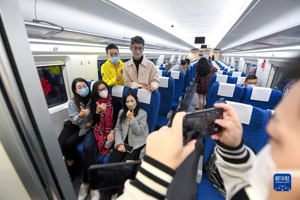 1月15日,在深圳北站,搭乘恢復(fù)通車后內(nèi)地駛往香港首趟列車G5607次的乘客在車廂里留影。