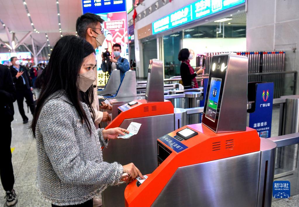 1月15日,在深圳北站,搭乘恢復通車后內地駛往香港首趟列車G5607次的乘客通過閘機進站。