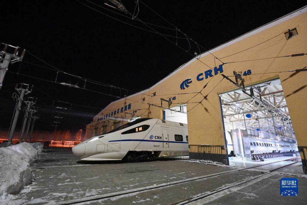 1月14日晚,完成檢修的動車組駛出烏魯木齊車輛段動車組運用所檢修庫。