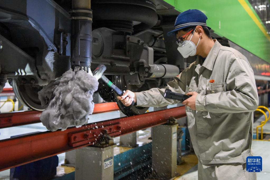 1月14日北方小年夜,烏魯木齊車輛段動車組運用所檢修庫內燈火通明,白天馳騁天山南北的動車在這里集結,一群青年機械師在連夜進行檢查、測試、維修工作,以保障動車運行安全。