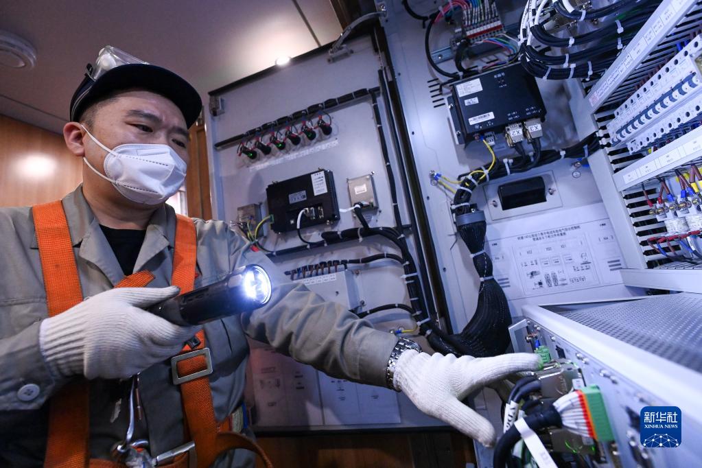 1月14日晚,在烏魯木齊車輛段動車組運用所,機械師在檢查電氣綜合控制柜。