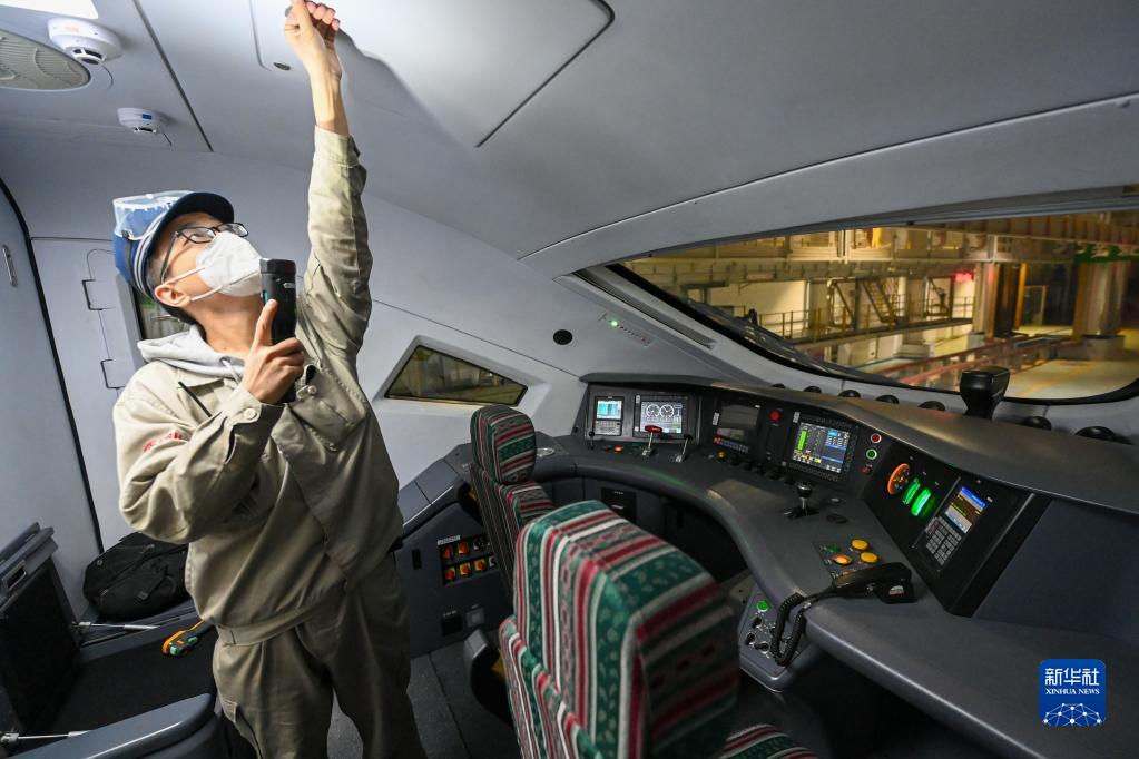 1月14日晚,在烏魯木齊車輛段動(dòng)車組運(yùn)用所,機(jī)械師檢查動(dòng)車組司機(jī)室設(shè)備。