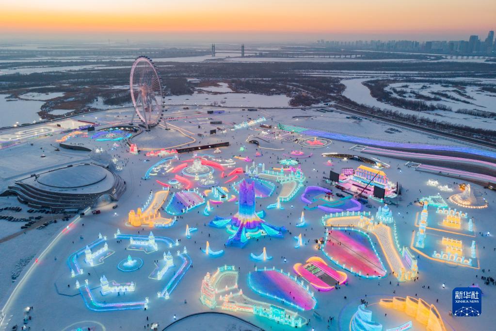 1月3日拍攝的夕陽(yáng)下的哈爾濱冰雪大世界園區(qū)(無(wú)人機(jī)照片)。