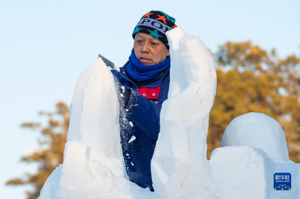 1月10日,在哈爾濱太陽島雪博會園區,第二十三屆黑龍江省雪雕比賽參賽選手進行雪雕創作。