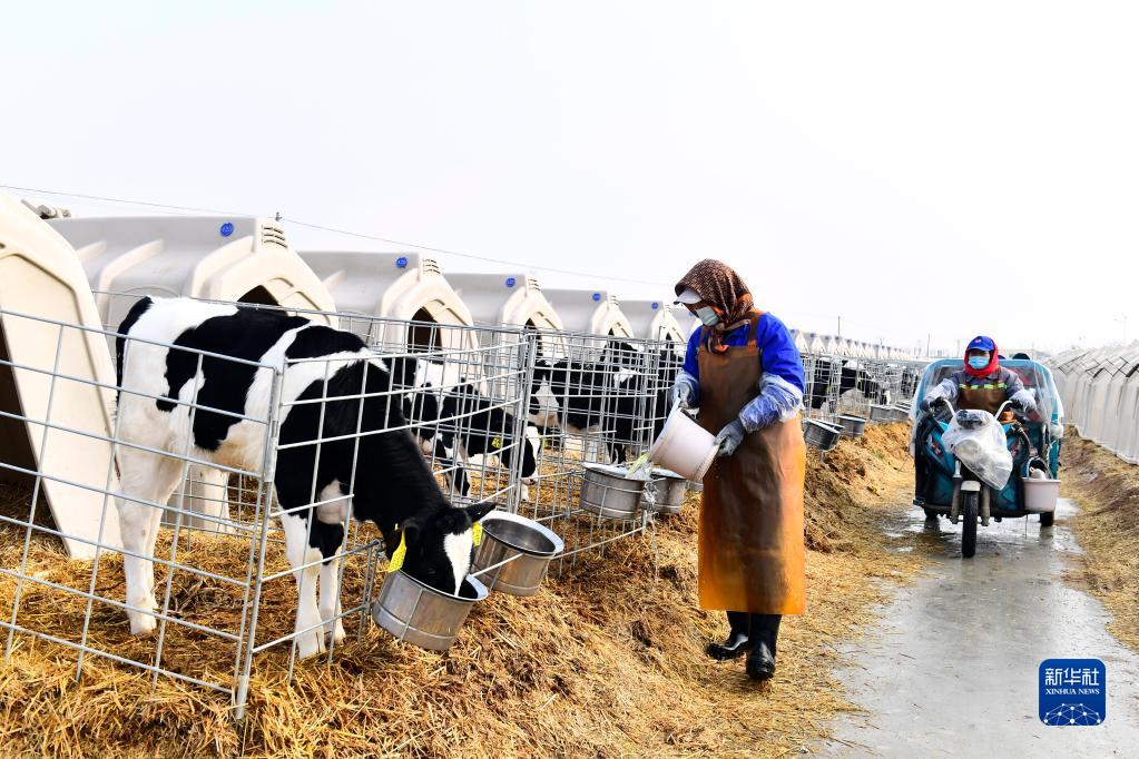 1月15日,在衛崗乳業日照鮮純生態牧業有限公司,工作人員為犢牛添加營養水。