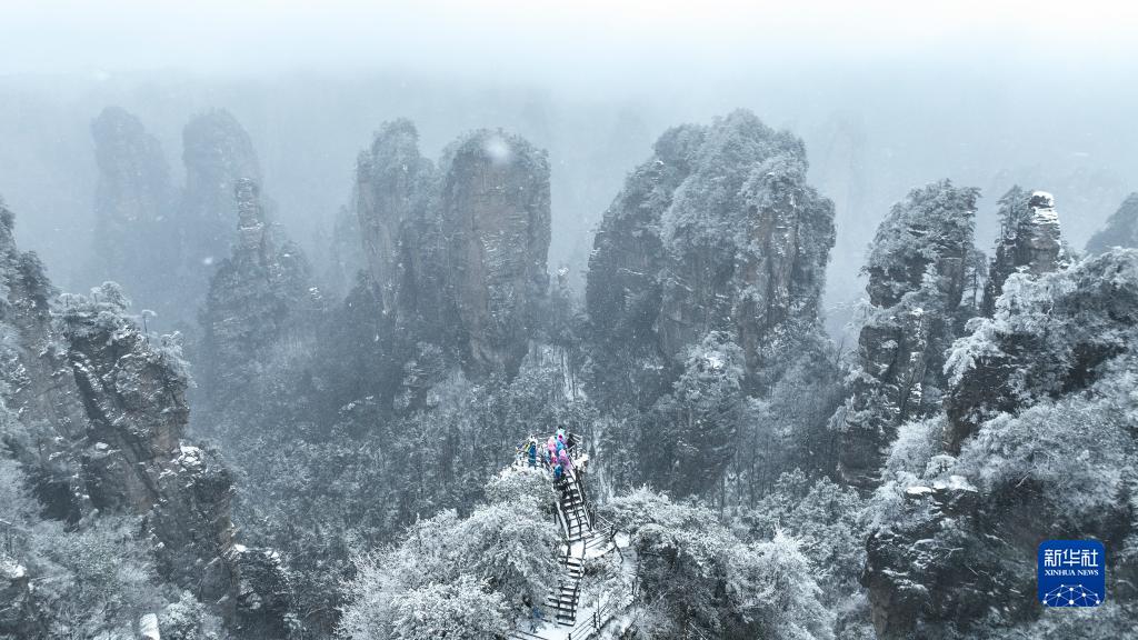 當日,湖南張家界國家森林公園大雪紛飛,銀裝素裹,宛如畫卷,吸引不少游客。