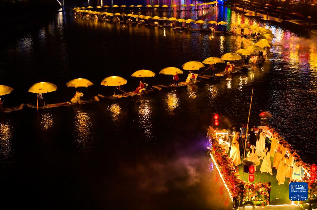 當日,在湖北省恩施土家族苗族自治州宣恩縣貢水河上,一場“貢水游龍”迎新春活動吸引不少市民游客參與體驗。“貢水游龍”由數十條竹筏作“龍身”,輔以燈光、音樂,人們可以在貢水河上“乘龍”觀賞璀璨夜景,歡樂迎新春。