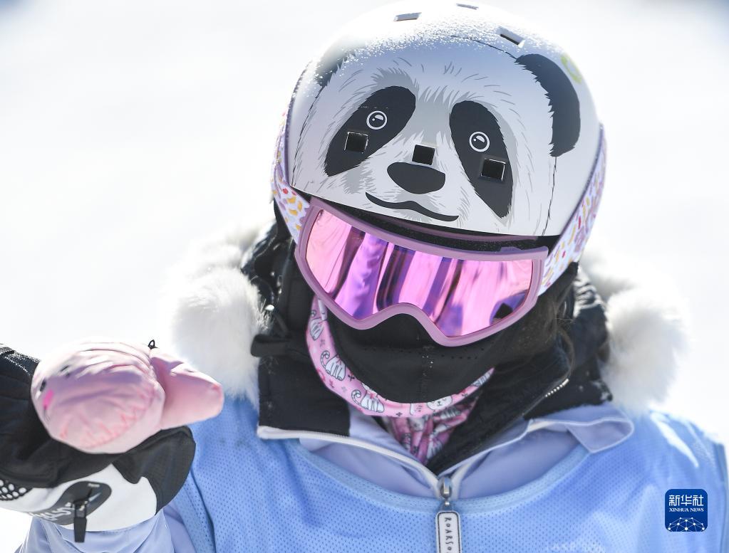 1月15日,一位小朋友滑雪時(shí)頭戴熊貓紋飾的頭盔。