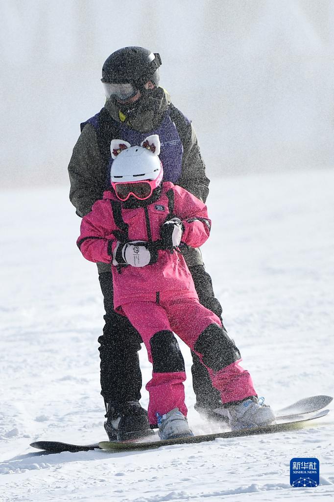 1月15日,一位小朋友(前)在教練的指導下練習單板滑雪。