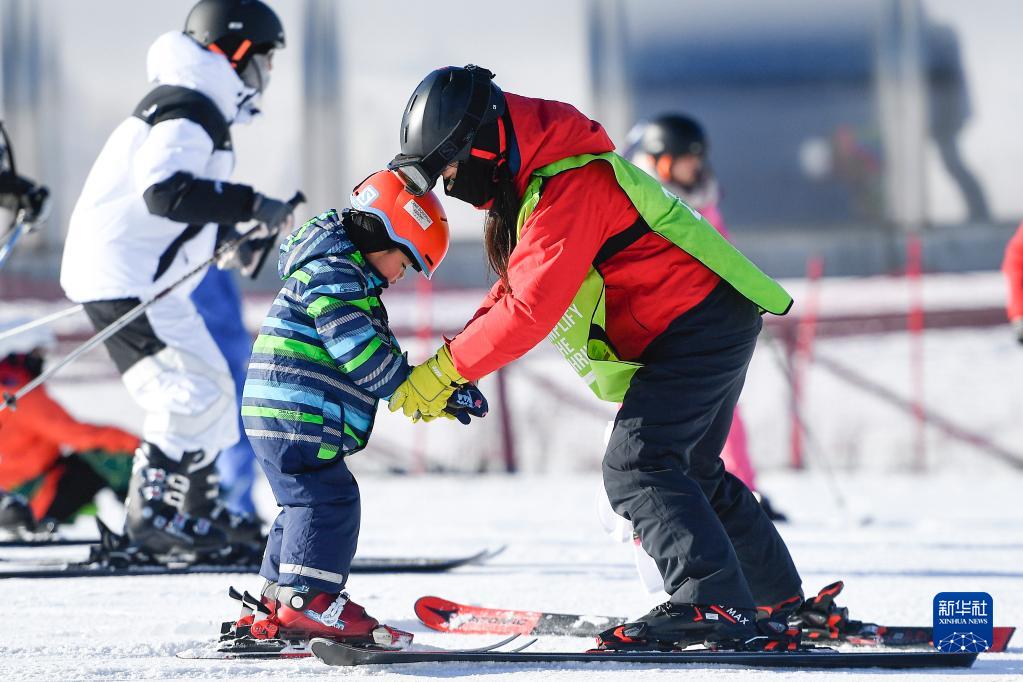 1月15日,一位小朋友(前左)在教練的指導下學習滑雪。