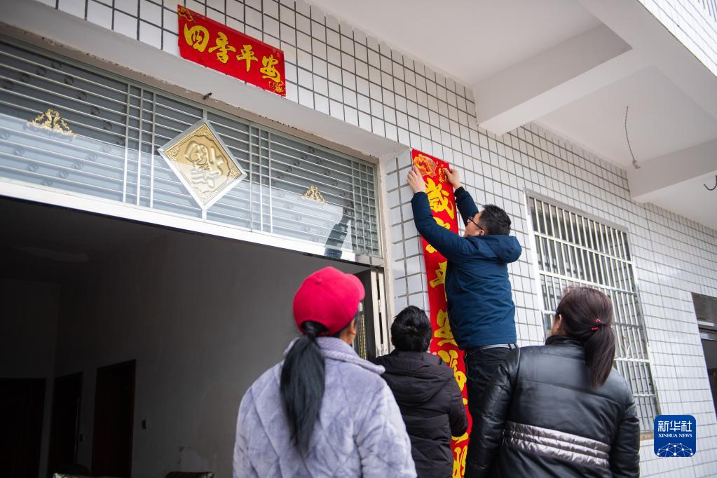 1月15日,在漢壽縣滄浪街道老鸛樹社區,鄉村振興駐村工作隊隊員程鵬(右二)給脫貧戶家貼春聯。