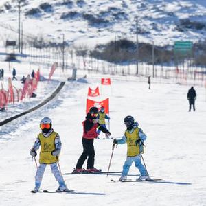 在新疆白云國際滑雪場上,小朋友們跟隨教練學習滑雪技能(1月13日攝)。