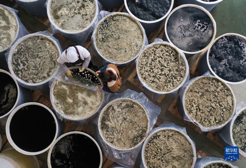 1月16日,工人在貴州省黔東南苗族侗族自治州三穗縣一家食品加工廠檢查皮蛋質量(無人機照片)。