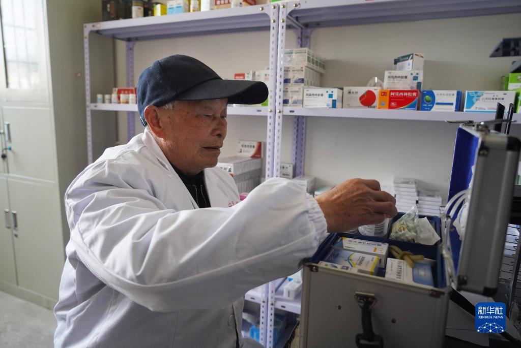 在江西省豐城市鐵路鎮楊坊村衛生所,村醫徐秋生檢查藥箱,準備前往行動不便的徐全香老人家中巡診(1月11日攝)。